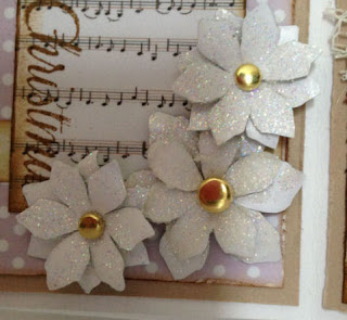 The poinsettia's in the left panel are made using the Flower Shapes (1) stamp set. I've stamped them onto the back of white paper, cut out and turned over (so there's no black edge). I covered them in Glossy Accents and dipped the entire flower into Glamour Dust then layered them up with a brad in the middle.